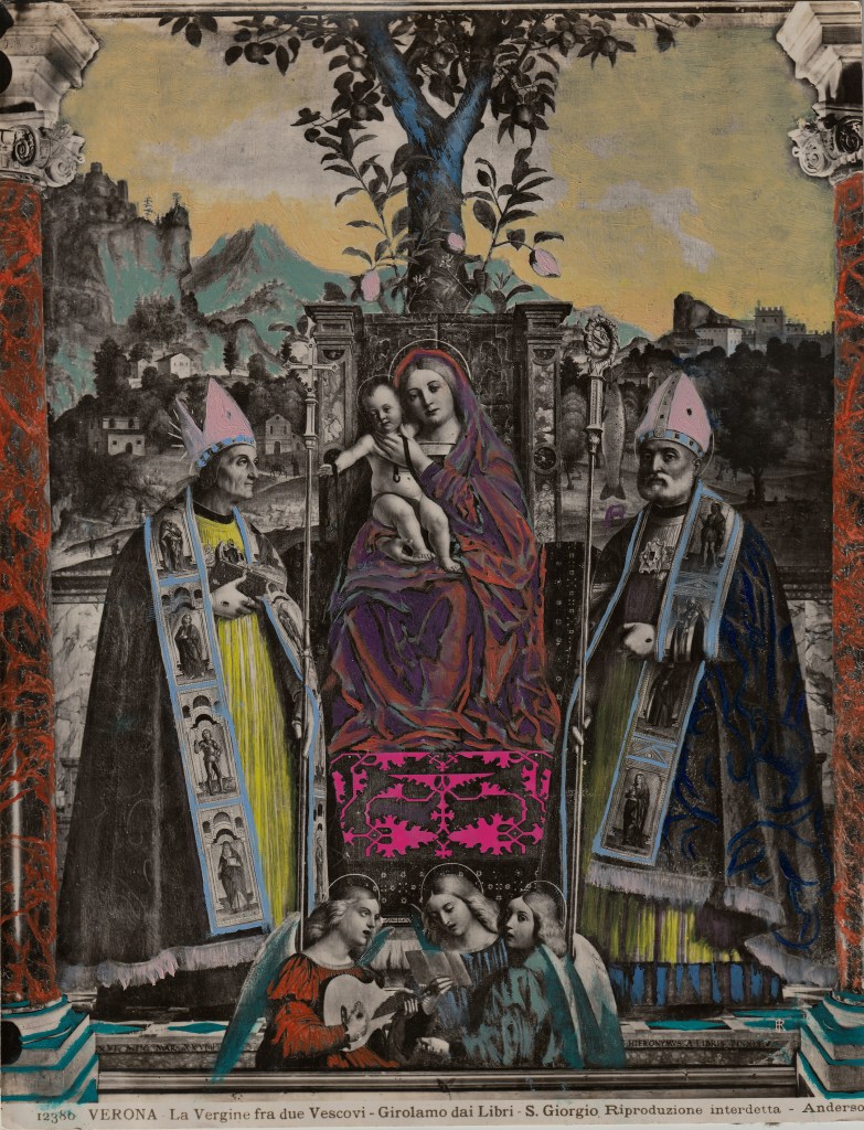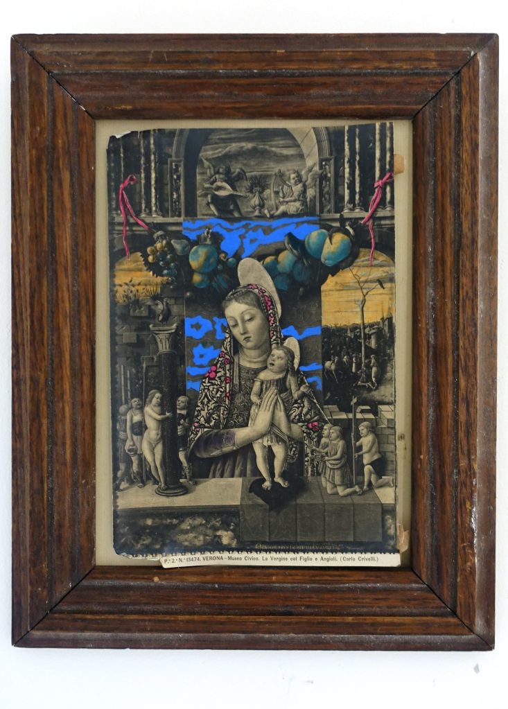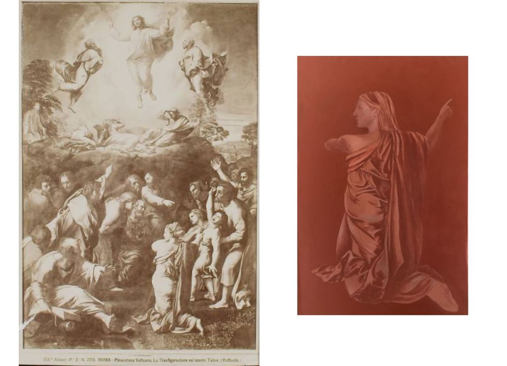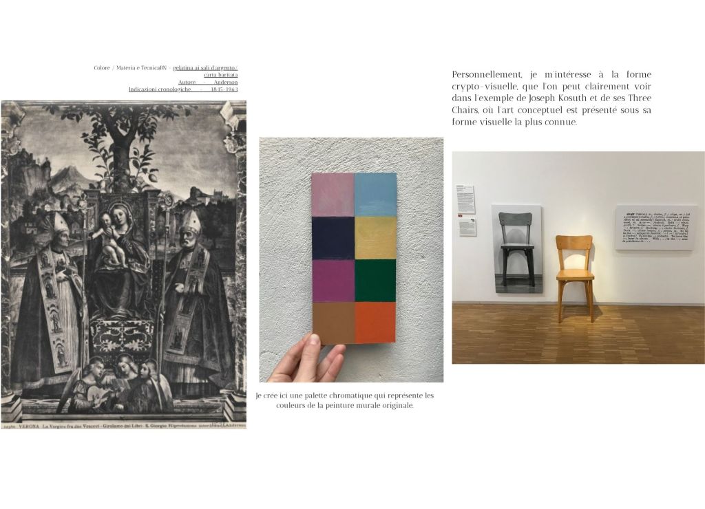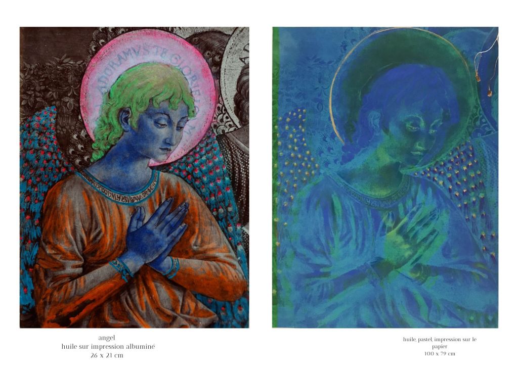 J’ai cherché à offrir une nouvelle lecture spéculative de la copie, de l’imitation et du faux. L’utilisation de la photographie, associée à la procédure de conservation et de restauration, devient un moyen de révéler cette réflexion crypto-visuelle. Ce médium établit une chaîne de temporalité de manière voilée, et l’acte de peindre lui-même devient la clé de cette chaîne. La peinture peut nous révéler les clés du mystère de l’art de la mémoire. Les singularités chromatiques sont les signes-transits de la matière de la peinture, c’est-à-dire la couleur qui fait passer chaque figure du passé au présent, à la présence ; qui ne “colore” plus les objets, mais fait irruption à l’intérieur et détruit le décorum de la visibilité, par le fait même de la manifestation.